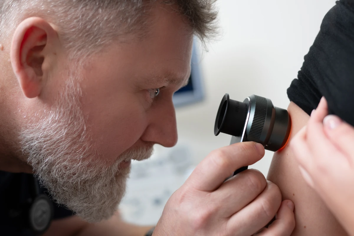 Die Hautkrebsvorsorge ist eine wichtige Maßnahme, um Hautveränderungen frühzeitig zu identifizieren. Mit einem Dermatoskop, einer Art „Lupenleuchte“, führen wir eine detaillierte Untersuchung Ihrer Haut durch. So können wir auffällige Hautveränderungen besser erkennen und, falls notwendig, schnell handeln. Insbesondere Personen mit heller Haut oder familiärer Vorbelastung sollten regelmäßig zur Hautkrebsvorsorge gehen. Sie wird ab dem 35. Lebensjahr alle zwei Jahre von der gesetzlichen Krankenkasse übernommen.